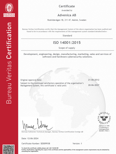 Vårt miljöledningscertifikat hjälper oss att minimera och kontinuerligt förbättra vår miljöpåverkan och vår efterlevnad av lagar och förordningar.